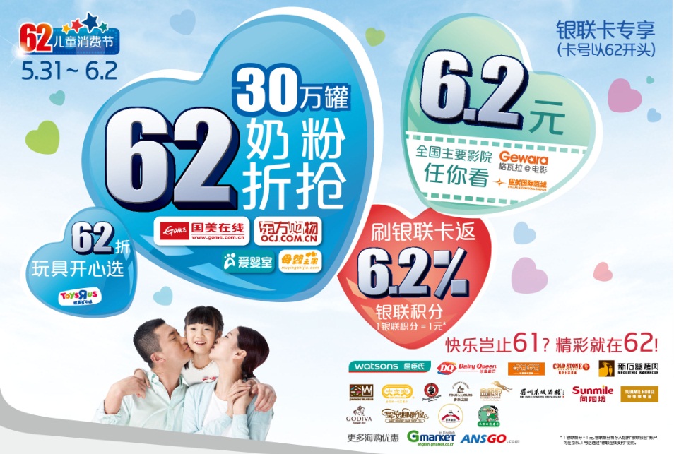1、刷62开头的银联卡享6.2折奶粉特价优惠。