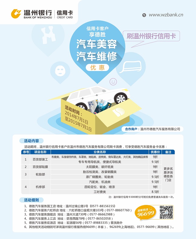 刷温州银行信用卡享德胜汽车服务优惠活动