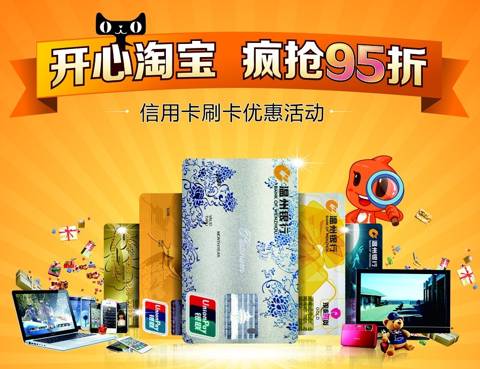 活动期间,在淘宝网或天猫商城购物选择温州银行信用卡快捷支付渠道,可享收银台价格9.5折,最高10元封顶,每位客户每月限享一次,名额有限,先到先得。