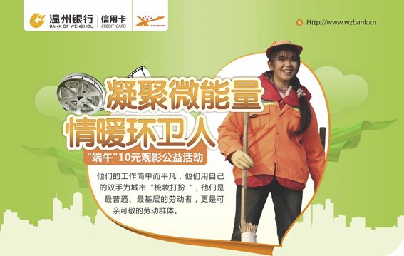 活动期间,持温州银行信用卡至温州新国光影城刷卡购票,即可享受10元购当天2D或3D电影票一张。当天9点30开始接受购票,活动期间单卡限刷1次,每卡限2张,每日限200张,共3天,计600张,购完为止。本次活动所得票款将全额用于温州银行和柒零叁志愿者联合发起的“凝聚微能量 情暖环卫人”公益活动,让更多的人关注“城市美容师”—环卫工人,这个特殊的社会群体,让他们真正体会到社会的关怀,体会到温州银行的亲情。