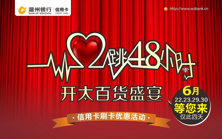 活动期间持温州银行信用卡至温州开太百货刷卡消费,单卡单笔满500元送50元开太储值卡。(活动期间单卡最高限送50元、单卡限送一次、每天限送100份。)