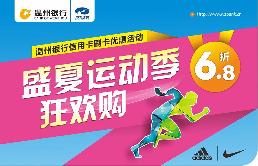 活动期间,温州银行信用卡客户至温州锐力体育指定Nike、Adidas旗舰店刷温州银行信用卡购物,即享6.8折优惠(不限金额/不限数量/限量款除外)。