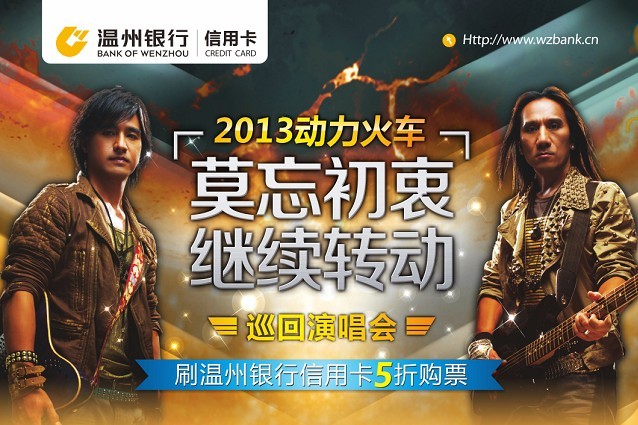 活动期间,持温州银行信用卡至温州大剧院刷卡购《2013动力火车 莫忘初衷 继续转动 巡回演唱会》门票,可享5折优惠(活动期间单卡限刷1次/单卡最高限购2张/限量100张/不限座位)。2013年9月14日(周六)当天早上9:00开始接受购票,先到先得,售完为止。