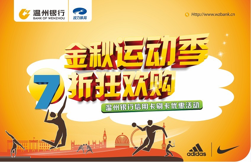 活动期间,温州银行信用卡客户至温州锐力体育指定Nike、Adidas旗舰店刷温州银行信用卡购物,即享7折优惠(不限金额/不限数量/限量款除外)。