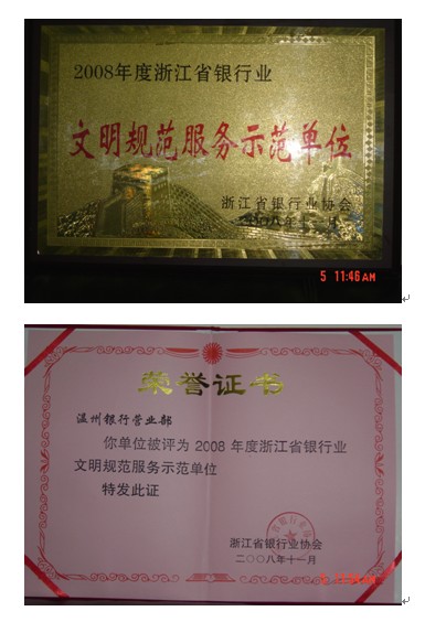 2008年11月,浙江省银行业协会授予温州银行营业部二○○八年度“文明规范服务示范单位”称号。