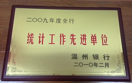 2010年2月,温州银行总行授予温州银行瑞安支行二〇〇九年度全行“统计工作先进单位”称号。