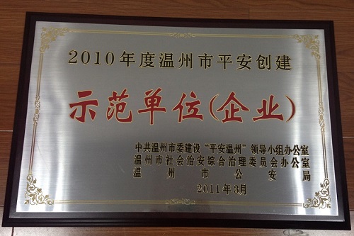 温州银行瑞安支行荣获二O一〇年度“温州市平安创建示范单位”