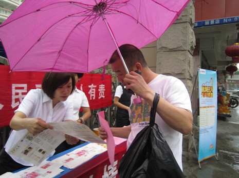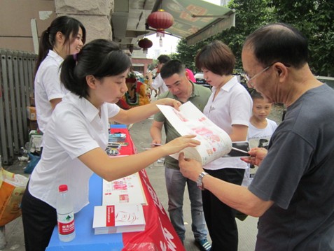 当日一早,宣传人员就开始布置宣传摊位、悬挂横幅、摆放宣传桌和宣传资料。虽然天空下着蒙蒙细雨,但由于为周末,附近出行的居民较多,人流较大,两个宣传咨询台前都围满人,有索要理财资料的和理财收益计算的,有询问假币鉴别方法的、有想了解新版人民币特征的,还有拿出人民币现钞让宣传员们鉴别真伪的……宣传员对每个人提出的每个问题都认真讲解,宣传人员尽量使用平实的语言,使假币鉴别知识听起来通俗易懂,并拿出真假钞实物对照册给前来咨询的人们观看,使真假钞的区别一目了然。大家的耐心解答赢得了群众的好评。