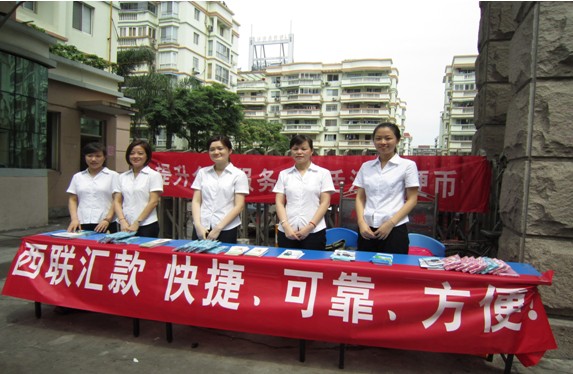 此次活动宣传点设在丽景花苑社区门口,以悬挂宣传条幅、发放宣传资料以及分发宣传礼品等方式向来往市民宣传西联汇款业务,介绍“西联汇款好礼相送”宣传活动。作为不同于传统国际汇款的速汇产品,西联汇款业务凭借其快捷、方便、可靠的优势,吸引了很多市民驻足,就汇款时间、汇款流程、结汇价格、手续费标准等问题进行咨询,现场工作人员都给予了耐心、仔细的讲解。