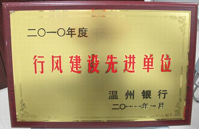 荣获2010年度温州银行行风建设先进单位荣誉称号
