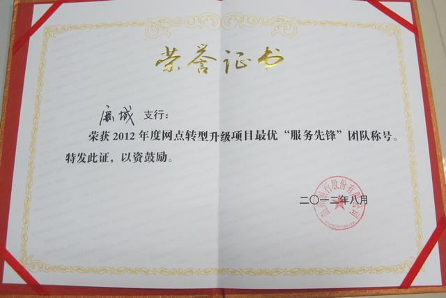 荣获网点转型升级项目最优“服务先锋”团队荣誉称号