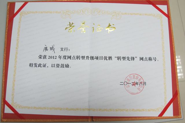 荣获2012年温州银行网点转型升级项目优胜“转型先锋”网点荣誉称号