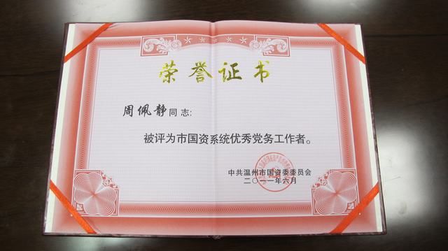 热烈祝贺温州银行鹿城支行周佩静同志荣获2011年温州市国资系统优秀党务工作者荣誉称号
