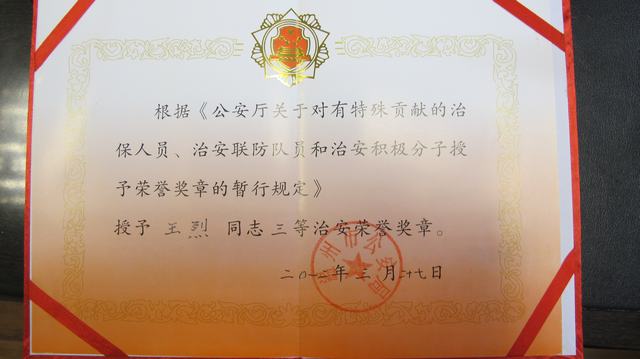 热烈祝贺温州银行鹿城支行王烈同志荣获2012年温州市三等治安荣誉奖章