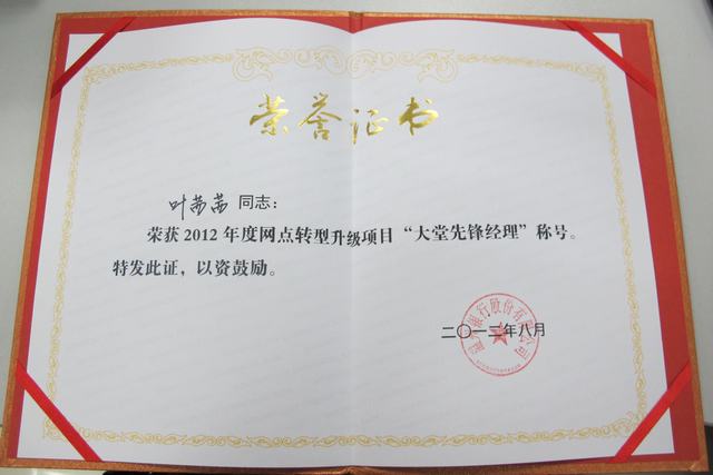 热烈祝贺温州银行鹿城支行营业部叶茜茜同志荣获温州银行网点转型升级项目“