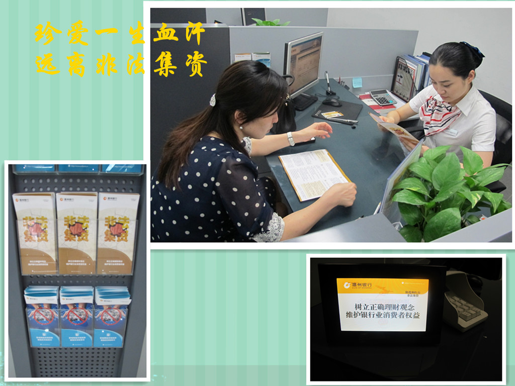 为了增强广大群众的法制观念,深刻认识非法集资的社会危害性,提高风险防范意识和识别能力。鹿城支行营业部于5月20日开展“珍惜一生血汗,远离非法集资”宣传活动。5月30日在支行营业部门口再次开展“防范和打击非法集资”活动。活动现场拉起横幅,摆放了人行及总行下发的《防范和打击非法集资》宣传资料,为市民精心准备的小礼品。员工们绘声绘色向公众讲解非法集资的手段及基础知识并以通俗易懂的方式传达给社会公众。为了这次的防范和打击非法集资宣传活动能全面开展,管辖行营业大厅随处可见防范和打击非法集资的宣传资料,在每个柜台的LED进行宣传,在客户办理业务的空闲时,能关注了解非法集资。工作人员为每位前来办理业务的客户深入浅出地讲解着平常生活中可能涉及到的非法集资方式,力图让客户明白非法集资对自身及社会的危害性及防范和打击非法集资的重要意义。