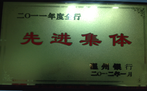 2012年1月,温州银行授予温州银行营高新区支行二○一一年度“先进集体”称号。