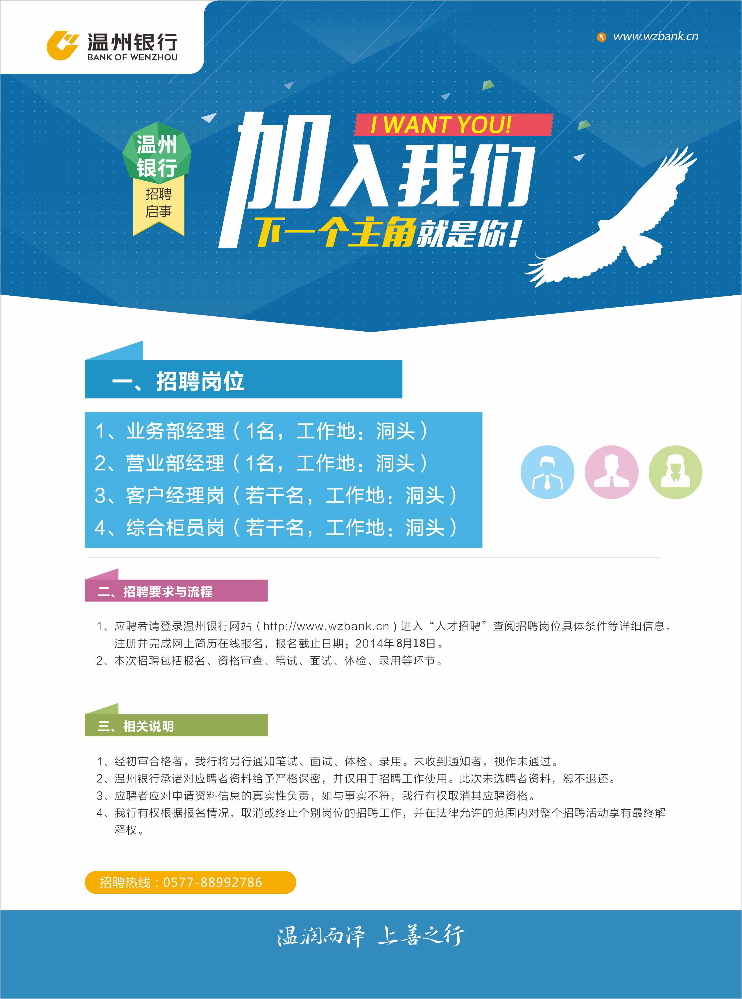 1、应聘者请登录温州银行网站(http://www.wzbank.cn)进入“人才招聘”查阅招聘岗位具体条件等详细信息,注册并完成网上简历在线报名,报名截止日期:2014年08月18日。