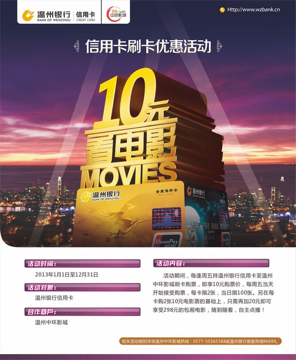 活动期间,每逢周五持温州银行信用卡至温州中环影城刷卡购票,即享10元/张购票价,每周五当天开始接受购票,每卡限2张,当日限100张。另在每卡购2张10元电影票的基础上,只需再加20元即可享受298元的包厢电影,随到随看,自主点播!