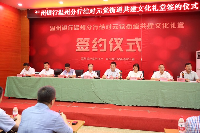 2018年5月30日,温州银行辖属温州分行与元觉文化礼堂结对共建签约仪式顺利举行,温州银行总行党委副书记、纪委书记叶刚,洞头区副区长张方任,名城集团副总经理吴维玲,温州市金融办监督三处处长缪国展,温州分行行长叶伟斌以及温州银行和元觉街道相关部门负责人等参加了签约仪式。