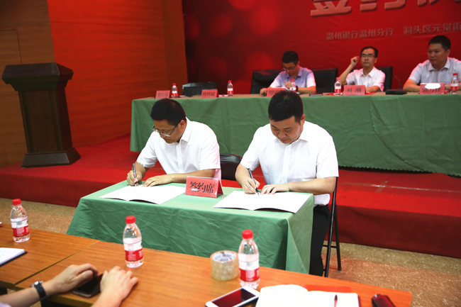 签约仪式上,温州银行温州分行行长叶伟斌与元觉街道党工委书记詹景伟签订共建协议书,并交接共建资金。