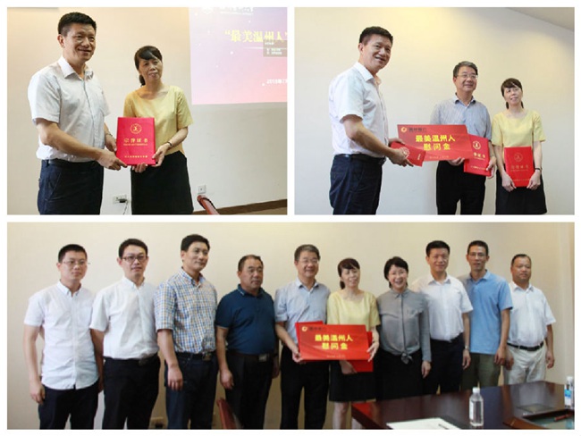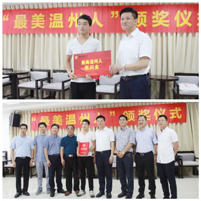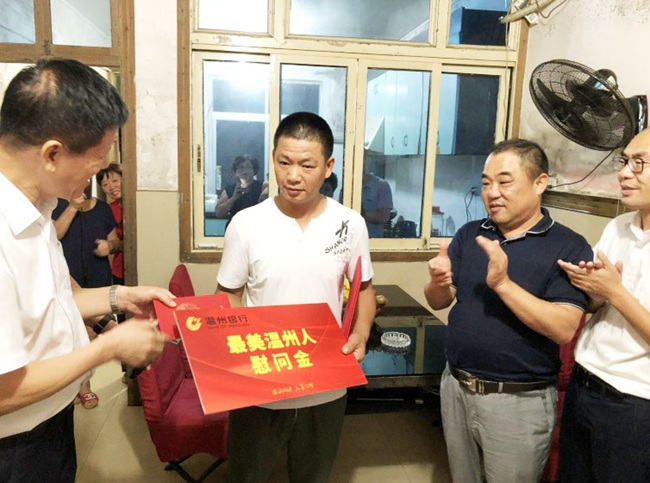 近日,温州银行工会主席林孝悌代表温州银行,与市委宣传部魏平生副部长以及市文明办相关人员一行,先后来到平阳县鳌江镇、温州医科大学和鹿城丰门街道,向临危不惧、拯救失控大巴车乘客的“临时司机”谢上璠,紧急抢救航班上发病患者的卢中秋等3名医护人员,以及为救护车带路的外卖小哥卢湖成,颁发了“最美温州人”荣誉证书,并送上“最美温州人”公益基金慰问金。