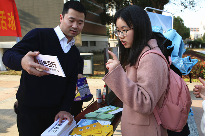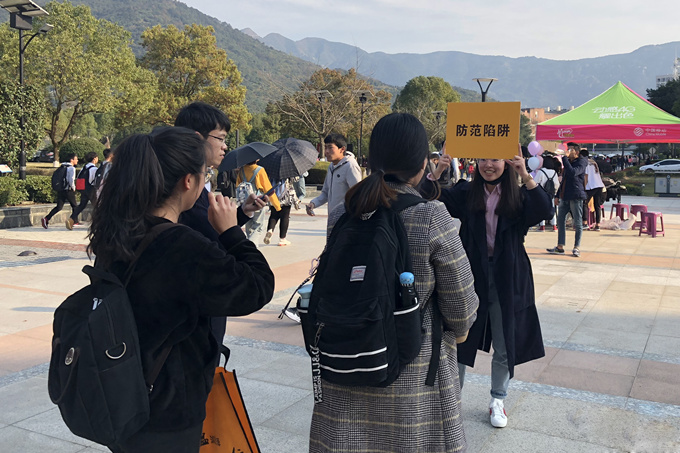 来自护理专业的张同学从银行工作人员的手中接过奖品,这是他参与金融知识你来比划我来猜活动获得的“战利品”。据悉,为了迎合大学生的口味,引导和增强大学生们对金融知识的理解和兴趣,温州银行在宣传活动中设置了丰富的互动环节,金融知识你来比划我来猜、金融知识幸运球趣味游戏、主题相框合影、金融知识宣传等,有趣味地传递金融知识、点燃校园氛围,掀起了一阵热潮。