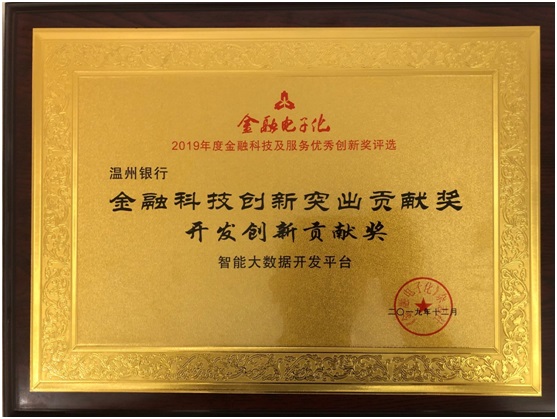 近日,由中国人民银行旗下《金融电子化》杂志社主办、北京金融科技产业联盟协办的“2019中国金融科技年会暨第十届金融科技及服务优秀创新奖颁奖典礼”在北京举行,来自金融机构、行业协会和学会、第三方支付公司、金融科技公司以及信息产业界的200多家单位与会。会上,温州银行“智能大数据开发平台”项目荣获“2019年度金融科技创新突出贡献奖——开发创新贡献奖”,为温州银行继2018年后,再度揽获这一重要奖项。