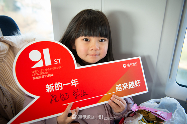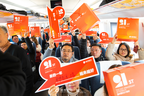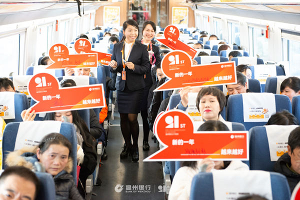 首发仪式后,温州银行工作人员开展专列首发互动活动。一句祝福的话语、一份对未来的希冀、一场贴心欢乐的活动,车厢中,旅客们写下对新年的真挚愿望与祝福,与温州银行祝福牌合影,分享照片集赞,一时间在朋友圈中成为“网红”。同时,温州银行工作人员也积极向旅客宣传金融知识、介绍银行特色小微产品、传递品牌精神,成为旅途中一道亮丽的风景线。