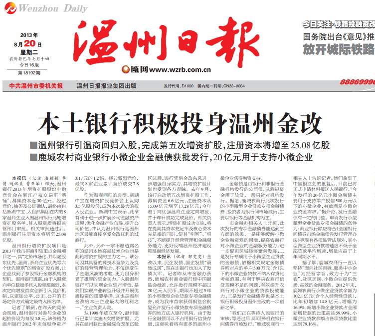 从1998年成立至今,温州银行已累计实施5次增资扩股。尤其在温州获批金融综合改革试验区以后,温州银行凭借金改东风进一步增强自身实力,其增资扩股计划也受到各方青睐。去年9月,温州银行启动第五次增资扩股工作,募集资金6.6亿元,注册资本从15.09亿元增至17.28亿元;今年着手向优强温商企业定向增发,并于昨日成功完成竞价。相关负责人表示,增资扩股成功实施,将在提高其资本充足率及核心资本充足率的同时,促其“引智”、“引技”,不断提升经营管理和金融服务能力,更好反哺温州经济建设和温商经济发展。