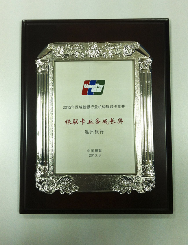 在中国银联股份有限公司主办的2012年区域性银行业机构银联卡竞赛中,我行凭借过去一年在银联卡业务的突出贡献,荣获“2012年度区域性银行业机构银联卡业务成长奖”。