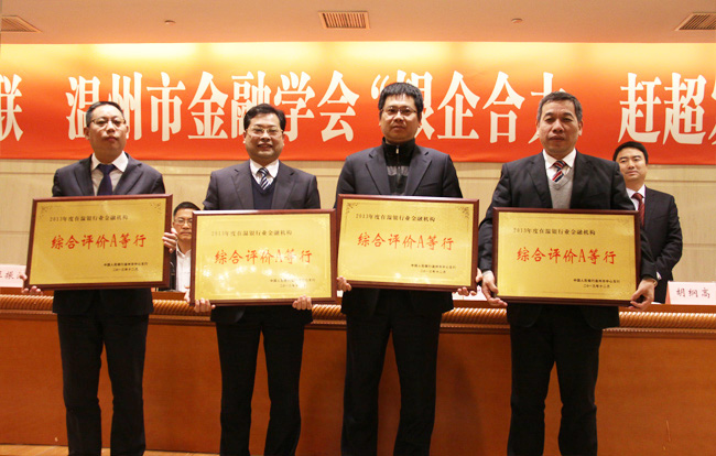 2013年12月25日,温州市企联、温州市金融学会召开“银企合力 赶超发展”大会。温州市委书记陈一新参加会议并作重要讲话。会上,邢增福董事长代表我行接受人行温州市中心支行颁发的“2013年度在温银行业金融机构综合评价A等行”荣誉(在温州30多家金融机构中仅有4家获此荣誉)。