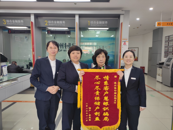 近日,李阿姨将一面印着“情系客户慧眼识骗局 尽心尽责保储户利益”的锦旗送到了温州银行解放路支行,感谢银行员工耐心劝阻,守护客户大额资金。