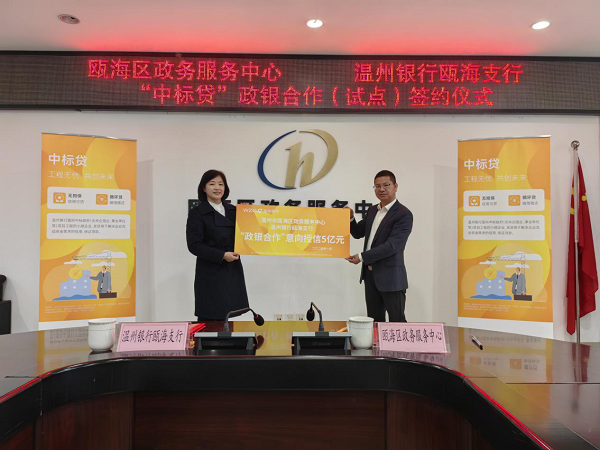为了进一步深化和推进“政银合作”,2024年1月29日,温州银行瓯海支行与瓯海区政务服务中心举行政务服务“中标贷”综合金融服务签约仪式,就共同构建“政银联动”授信创新模式、共同打造基层政务服务新场景进行深入合作。