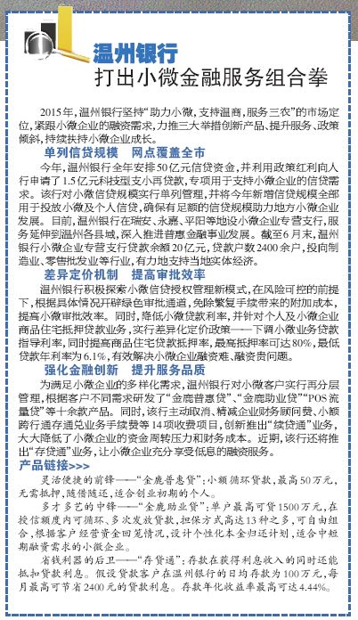 2015年7月16日,温州日报“金融创新助力温州小微企业发展”专题刊登了 “温州银行打出小微金融服务组合拳”,对我行扶持小微企业成长、支持实体经济发展的三大举措进行报道。